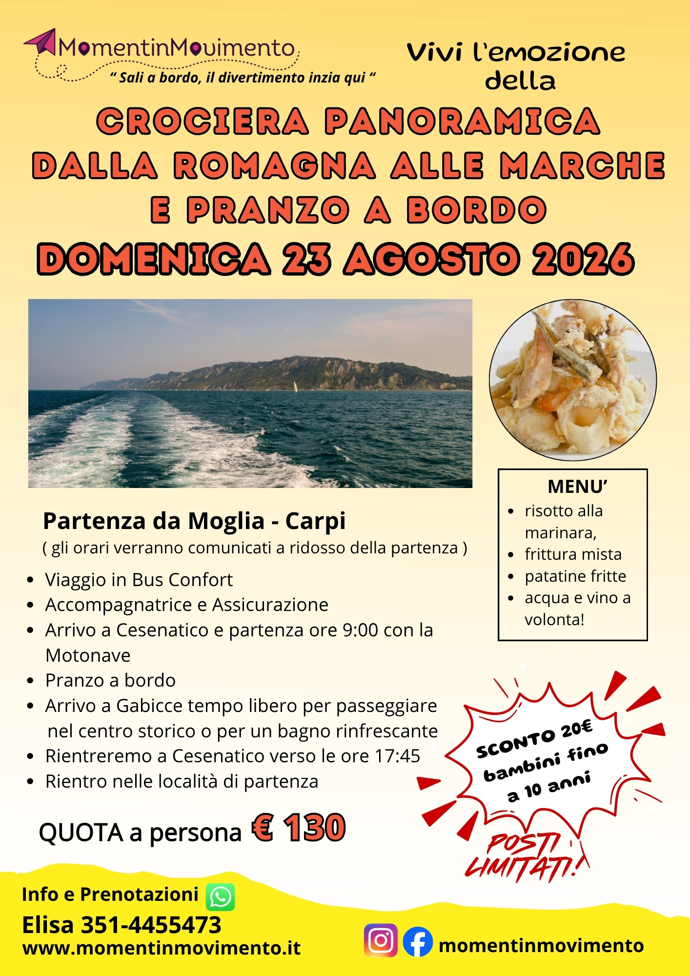 Arrivo a Gabicce: nel porto di Gabicce faremo tappa per 2 ore e 30 minuti. Qui, a bordo della Motonave, ci aspetta un pranzo delizioso.