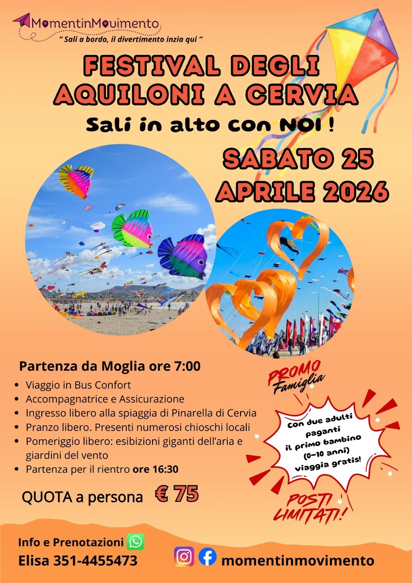 Preparati a vivere un’esperienza indimenticabile sulla spiaggia di Pinarella di Cervia. Lasciati incantare dalle esibizioni dei giganti dell’aria e dai giardini del vento in uno dei festival più colorati e famosi al mondo. Una giornata perfetta per famiglie, appassionati e per chiunque voglia tornare bambino per un giorno.