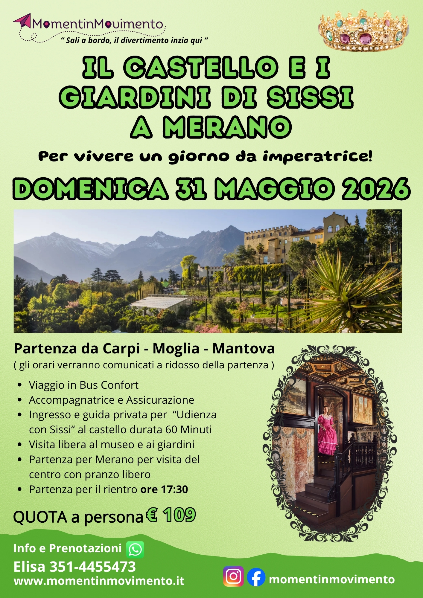 Sali a bordo per vivere un’occasione unica alla scoperta dei luoghi amati dalla principessa Sissi, tra giardini botanici mozzafiato e la storia incantata di un vero castello. Un’esperienza pensata per chi desidera unire cultura, natura e relax in una cornice da favola.