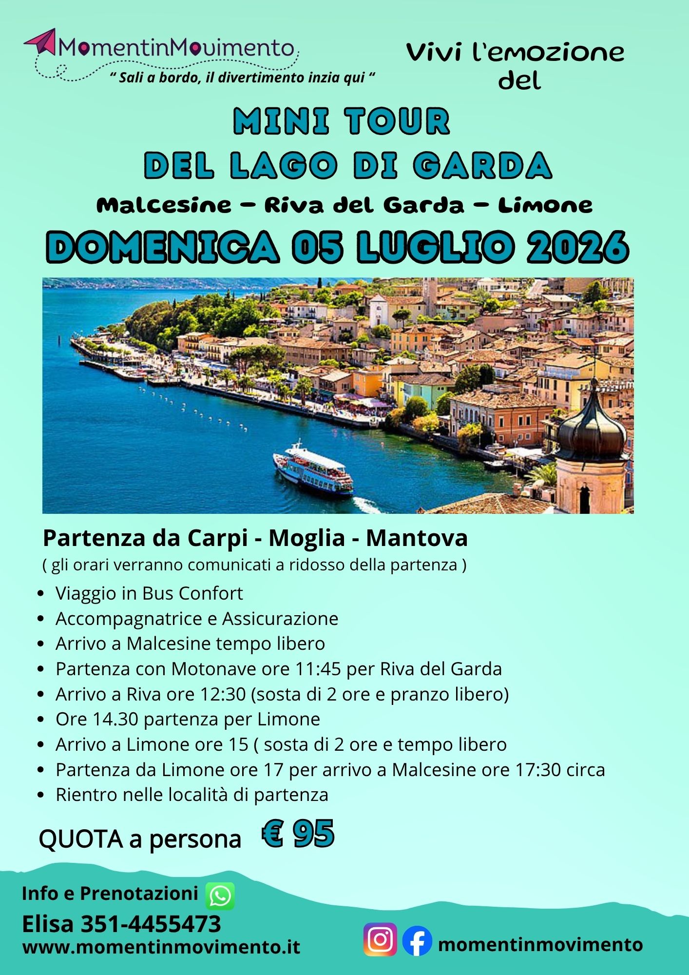 - Rientro: Partenza da Limone alle 17:00 con arrivo a Malcesine previsto per le 17:30.