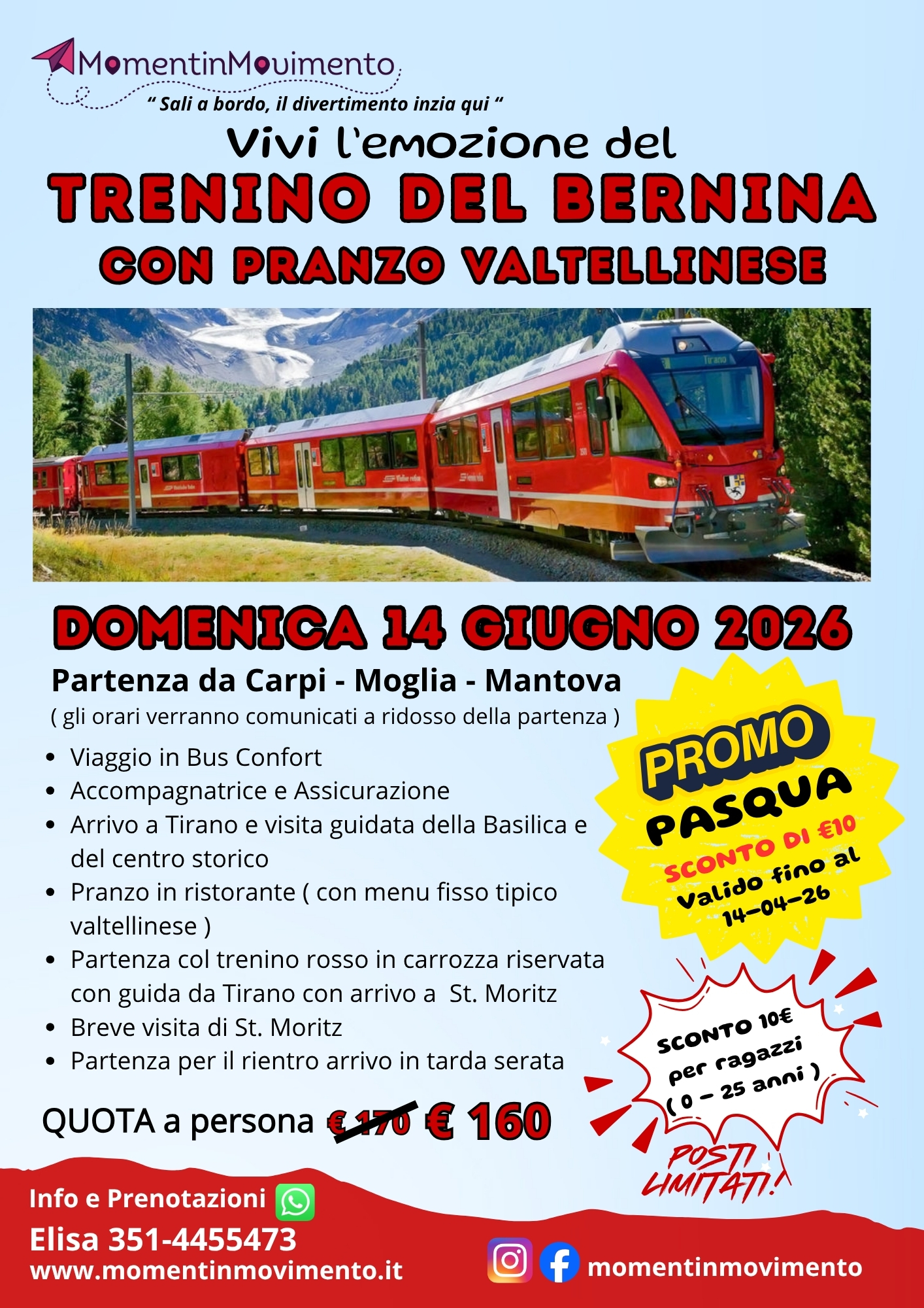 Nel primissimo pomeriggio, saliremo con la guida a bordo delle carrozze riservate “Momentinmovimento” del trenino. Ci aspetta un tragitto mozzafiato: Tirano - St. Moritz che raggiunge pendenze del 70% senza l'ausilio della cremagliera, toccando i 2253 metri di altitudine.